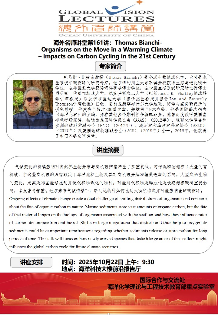 海外名师讲堂第一百六十一讲:Thomas Bianchi- Organisms on the Move in a Warming Climate – Impacts on Carbon Cycling in the 21st Century