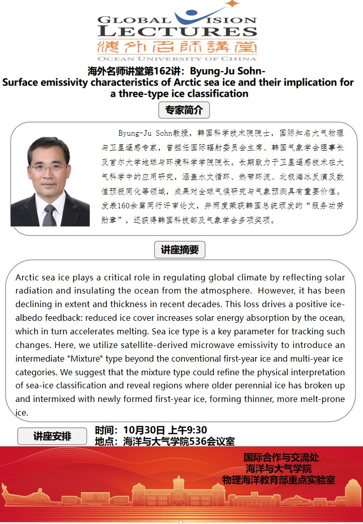 海外名师讲堂第一百六十二讲:Byung-Ju Sohn- Surface emissivity characteristics of Arctic sea ice and their implication for a three-type ice classification