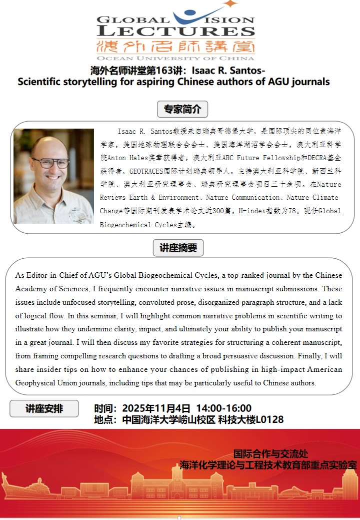 海外名师讲堂第一百六十三讲:Isaac R. Santos- Scientific storytelling for aspiring Chinese authors of AGU journals