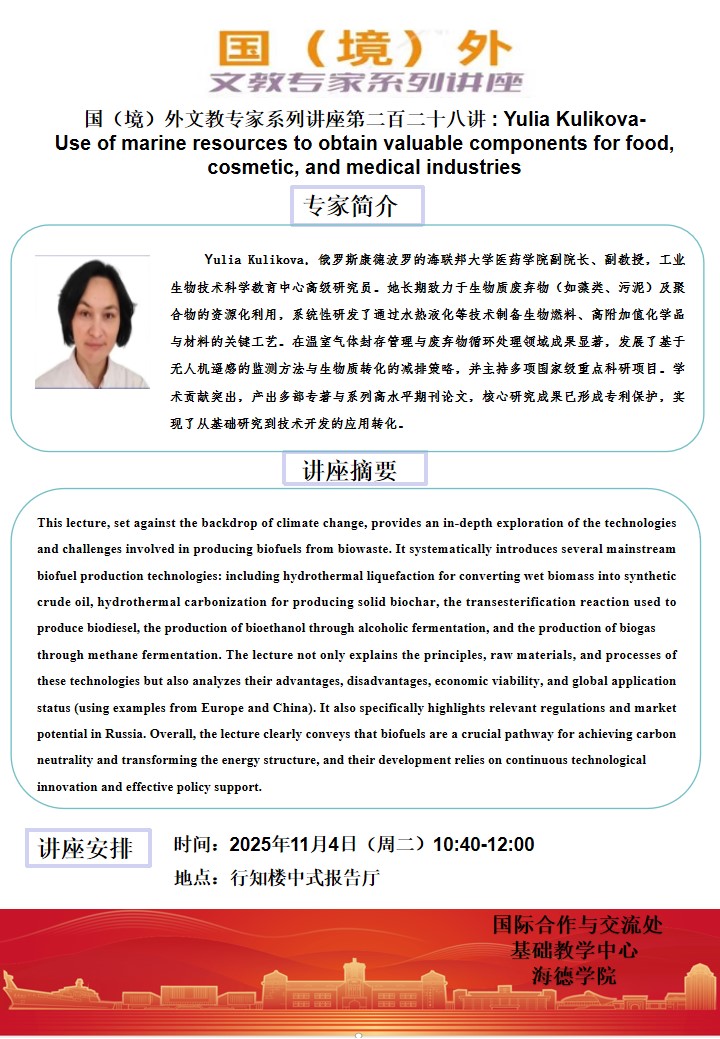 国(境)外文教专家系列讲座第二百二十八讲 : Yulia Kulikova- Use of marine resources to obtain valuable components for food, cosmetic, and medical industries