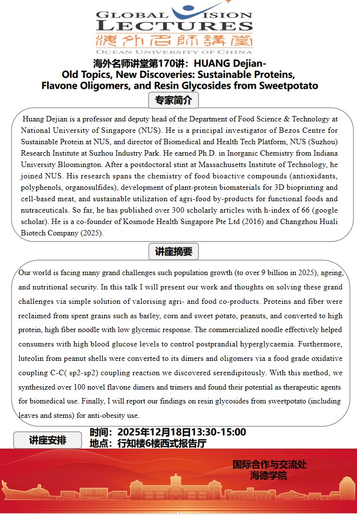 海外名师讲堂第一百七十讲:HUANG Dejian-Old Topics, New Discoveries: Sustainable Proteins, Flavone Oligomers, and Resin Glycosides from Sweetpotato