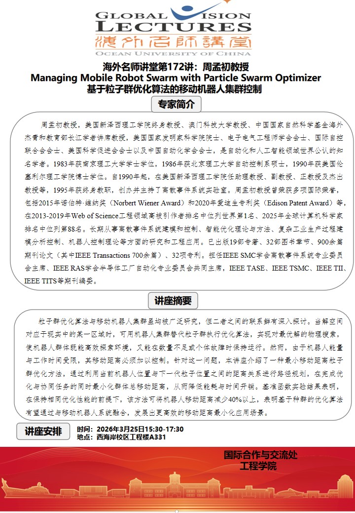 海外名师讲堂第一百七十二讲:周孟初教授 Managing Mobile Robot Swarm with Particle Swarm Optimizer 基于粒子群优化算法的移动机器人集群控制