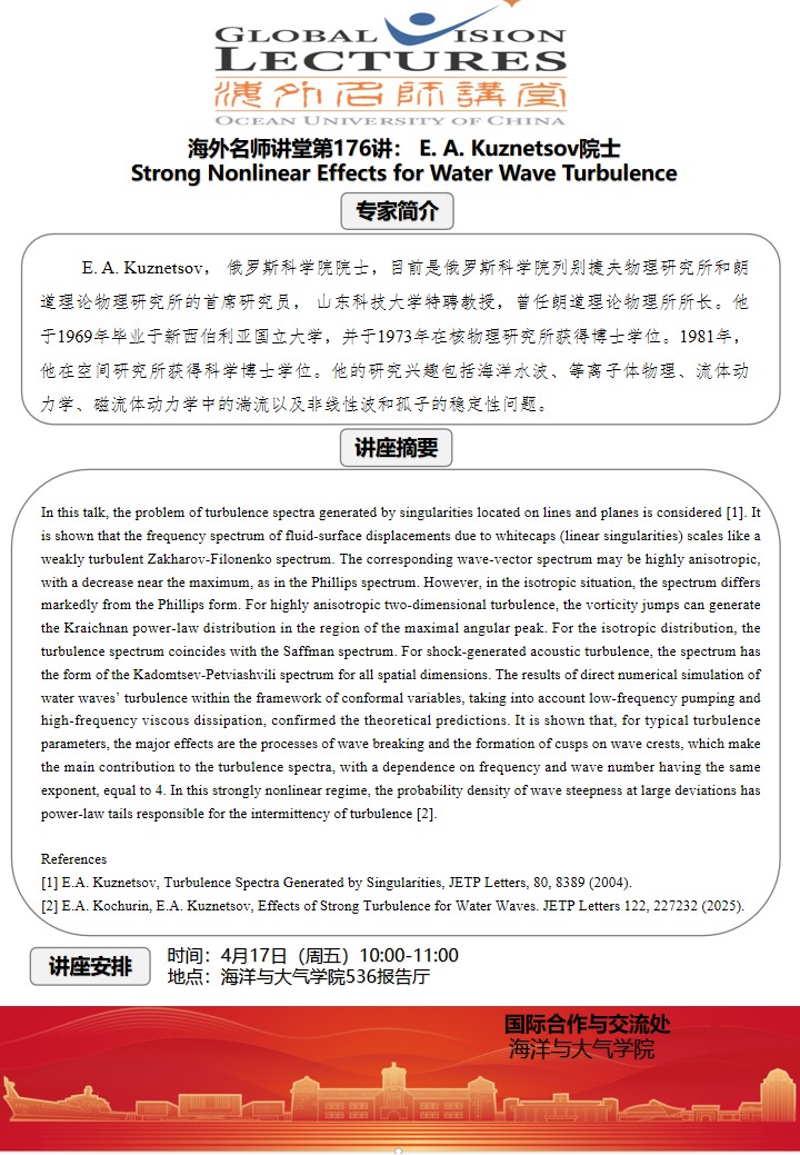 海外名师讲堂第一百七十六讲:E. A. Kuznetsov院士-Strong Nonlinear Effects for Water Wave Turbulence